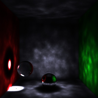 Below is an image of only the caustic photon map visualized in a simple box test scene. Notice how light is focused through the glass sphere and is reflected off the metallic one. Notice also how light bounces off the metallic sphere and is focused on the left wall. The top wall is dark because we are visualizing only the caustic effects in this scene. Note the "patchiness" of some of the caustics-- this is due to some roughness in the surfaces but can become smoother as more and more caustic photons are used in both the map and the estimate.