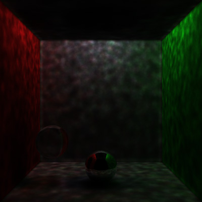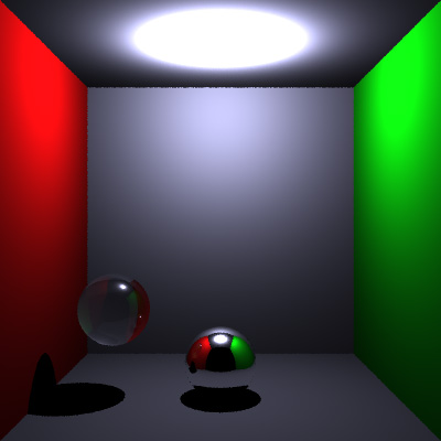 Traditional recursive ray traced image. Notice how no light is focused through the glass sphere and none is reflected off of the metallic sphere.