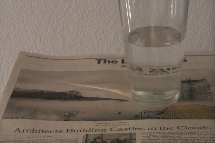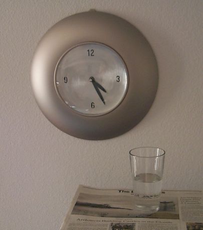 wall clock, a newpaper, and a glass of water. The scene had a number of