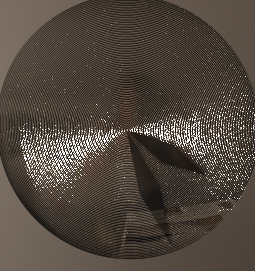 The model of the surface is basically a regular series of concentric ridges. This is rendered by taking the surface normal at a point and perturbing it perpendicular to the surface's u parameter direction, based on a sinusoidal function of the v parameter. There is a rib file interface consisting of the surface definition "brushedmetal" along with two parameters: "frequency" and "type".