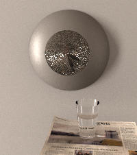 We modeled the scene in a hand-crafted .rib file using existing lrt primitives. A heightfield was used for the newpaper to approximate the slight upward curl in the upper left corner. The scene uses area lights extensively - the entire hemisphere in front of the wall plane is filled with area lights! While the shiny elements of the scene are what first made it interesting to us, effectively modeling the diffuse illumination proved challenging. The soft shadows and the gradual variation in illumination over the wall surface are important to the realism of the scene, and provided a real workout for our ray tracer.