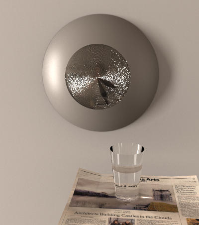 This is a rendering of the clock with a higher frequency of grooves. This eliminates the visibility of individual grooves, and makes the highlight more uniform. Notice the bow-tie shape of the highlight resulting from the area light far off to the left of the scene.