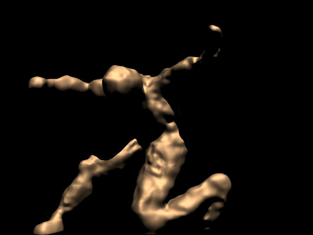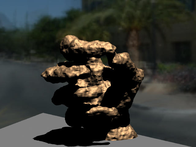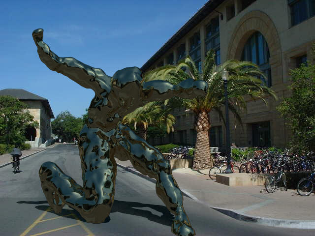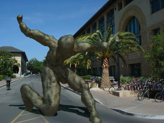 This project entailed several issues. The first was just creating the sculpture itself; I hadn't seen any readily available tool such as Maya which had the flexibility and ease-of-use required for sculpting on the computer. Once I created the sculptures I of course had to figure out an efficient way to ray-trace them. To get realistic lighting I had to construct an environment map of the area outside Gates, and again, had to to incorporate this into the ray-tracer. To get a more realistic surface detail on the sculpture I decided to work on a variation of hypertexture - while my original plan was to simulate chisel marks, porous stone, etc. it turned out I didn't have time to do that, but what I did implement was useful in directly simulating microfacets for a glossy, rough aluminum look. Finally, the synthetic image had to be composited with a real photo, taking into account shadows.