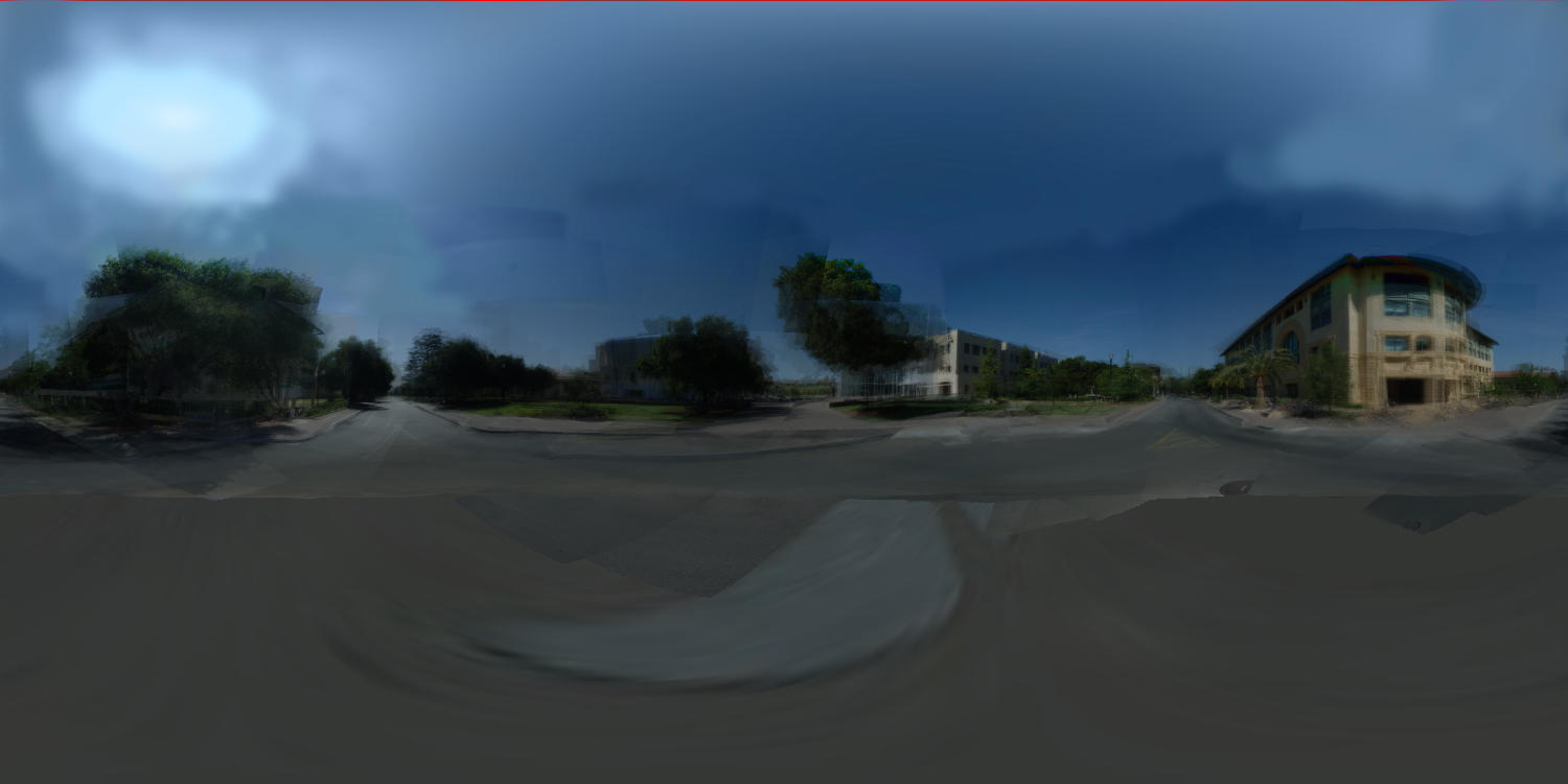 Once I had the poses, I assembled a very simplified geometrical representation of the scene (essentially a 10 sided prism). I first projected CIE standard clear-sky model onto this scene, then one by one projected and blended in the photographs (after rescaling them to try to match their exposure, and masking out bad pixels from the fountain or passers-by). Finally, I used photoshop to smooth other boundaries between photos and fill in a few holes.