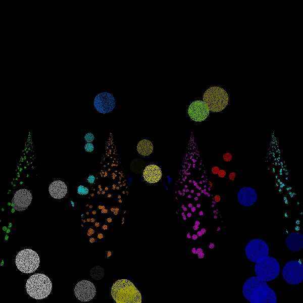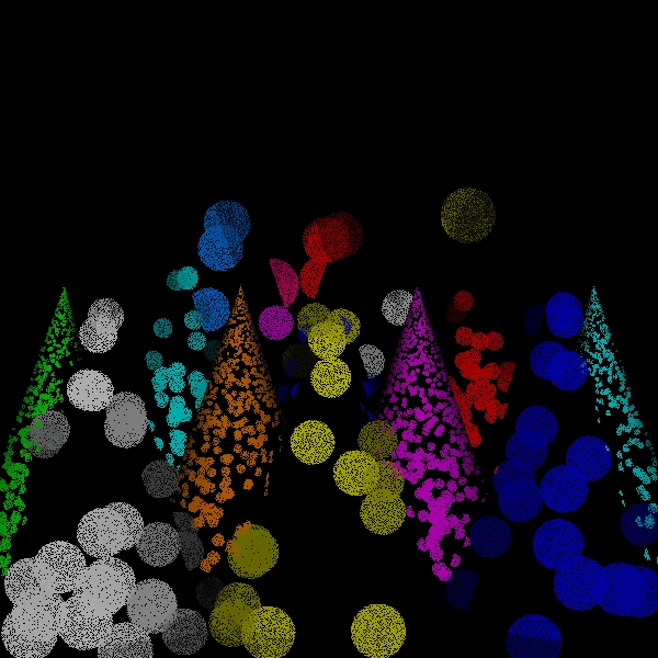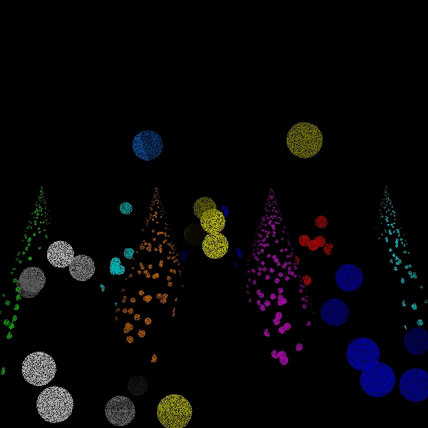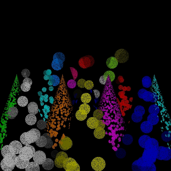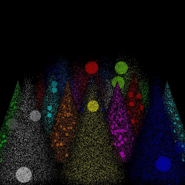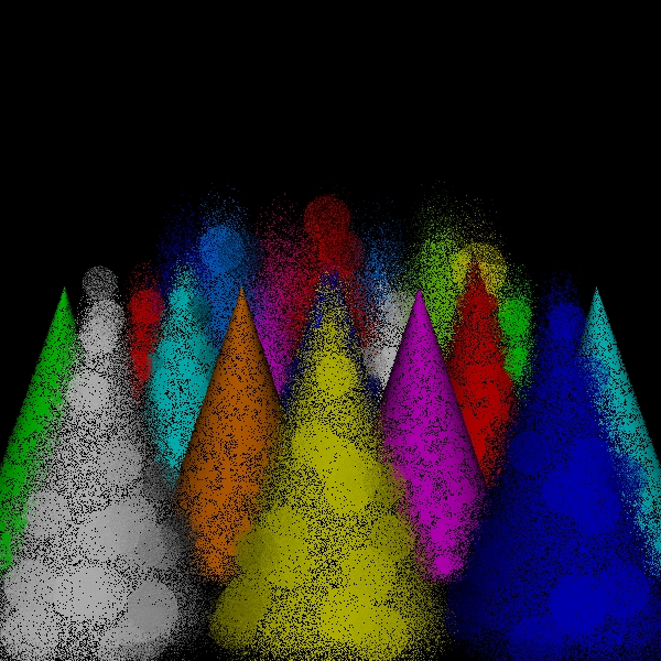 While the sampling of directions for shading should be increased to approach the correct solution in the limit, one of the versions of the algorithm that I have implemented simply uses one shading ray to process each scene point intersection. This is both for simplicity and to see how well the simplest approximation performs. Because the circles of confusion are flat shaded like spots, I call this the spots version. I call the original version the disks version to distinguish it from the spots version for lack of a better name.