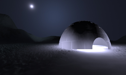 Igloo is modeled manually in the rib file and we used two layers of transluscent material. Outer layer is made by combining sphere patches with different transformations applied to each patch and Inner layer is made by a half sphere.