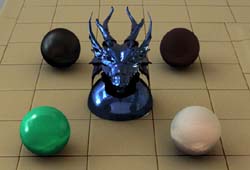 - Rendering the 3D Scene: I wrote a couple of new lrt modules to create the necessary renderings for the final compositing step. The first module, globalillum, is a new integrator that uses the radiance map computed from step 2 to light the scene. I assumed that the environment is large compared to the rendered scene, and thus only the direction is used in retrieving the radiance from the radiance map. Again, bilinear interpolation was applied where appropriate. Multiple importance sampling was required to reduce noise: the samples are generated using stratified sampling (via LatinHypercube) and then weighted using a combination of the probability distribution function and the brightness of the light in that direction. Irradiance caching is used to estimate indirect lighting effects. The second module I wrote was a trivial integrator that produces only the alpha channel of a scene. This image is required as a matte for the final compositing step.