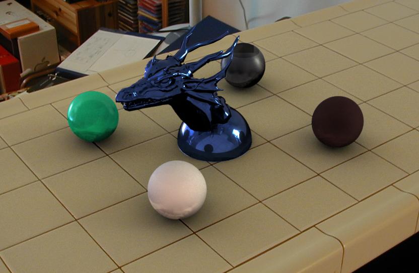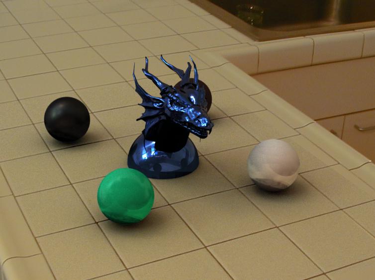 These above two scenes show how my image-based lighting implementation functions under two very different lighting conditions. The studio scene has four main light sources of different colours: two windows with sunlight shining in, and two overhead lights. This results in a various shadows in multiple directions, and multiple specular highlights on the plastic sphere and dragon. The Quad scene was taken on an overcast day, so the shadows are much softer and spread out. Both scenes would probably be reasonably difficult to reproduce without image-based lighting techniques.