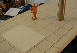 - Camera Calibration: The next step was to build a 3D representation of my scene. As I did not have access to any sort of sophisticated modeling software, I stuck with a simple geometric plane in a perspective view. I had rough measurements of the camera position and angle; then, I wrote a simple OpenGL utility that allowed me to input the various parameters and interactively adjust them until I had a reasonably good approximation of the perspective and object parameters. The output of this tool was a RIB file that could be directly rendered using lrt.
