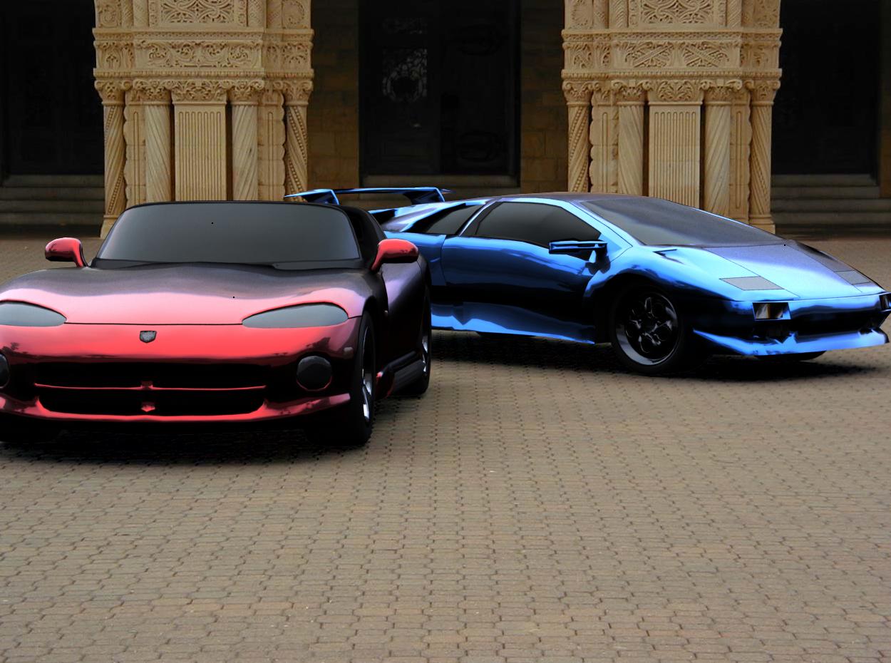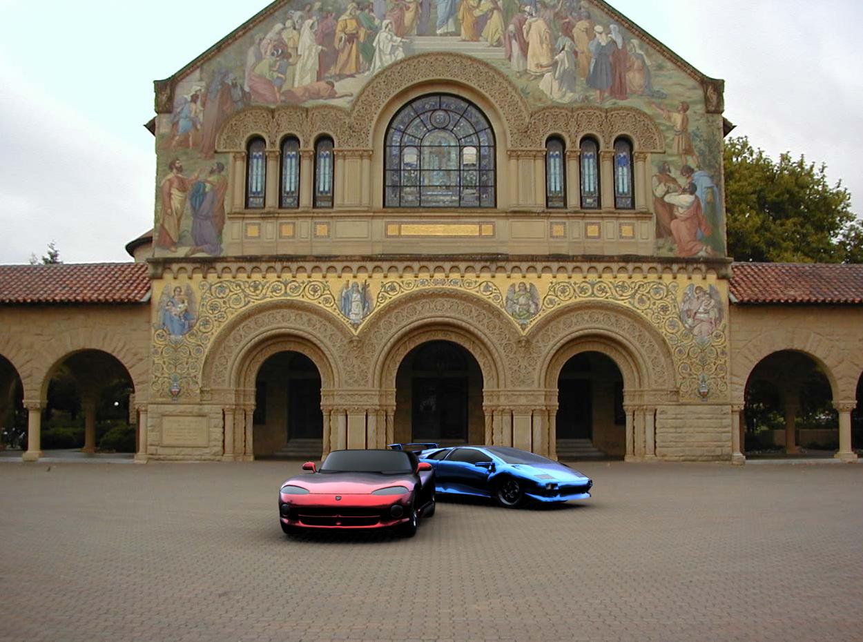 And finally, here are a couple of cars rendered into some pictures I took of the Stanford Quad on an overcast morning. The car on the left is a Chrysler/Dodge Viper RT/10, and the car on the right is a Lamborghini Diablo.