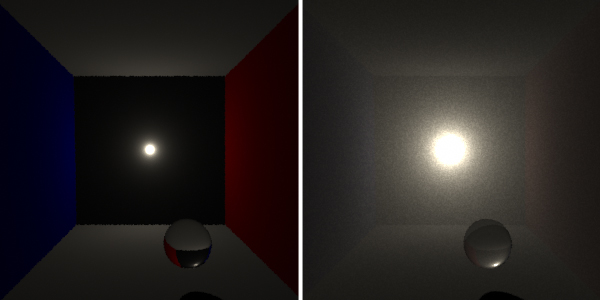 left is the image rendered with no scattering, and on the right with scattering.