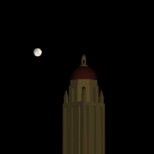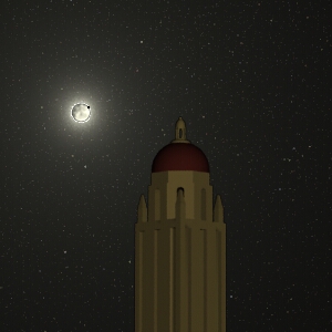 Getting the moon and Hoover Tower in the same scene. For some strange reason, our composed scene with the moon behind Hoover Tower had impossible lighting situations. The earth's surface was correctly dark, but the tower was being illuminated by the sun, impossible being that the earth was in the way of the sun's rays. Curious indeed.