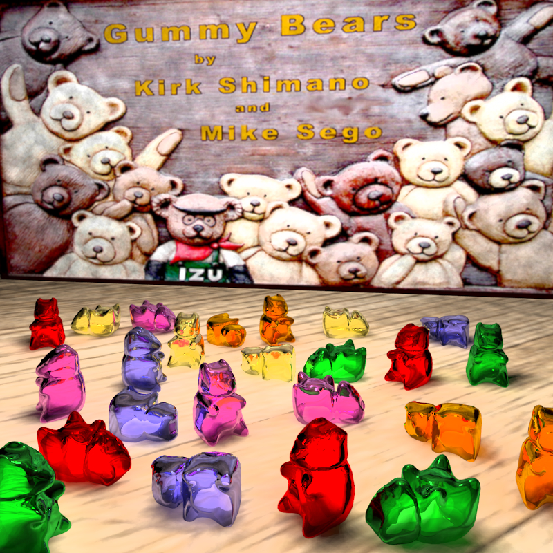 Our goal was to create a realistic rendering of Gummy Bears. Gummy products have a unique, translucent, semi-transparent appearance which is difficult to describe yet easy to identify. If incorrectly represented, this material could easily appear to be either too plastic or too liquid. Perfecting this representation requires careful attention to the reflecting of the light within the bears and will also require us to buy many bags of Gummy Bears! =-D