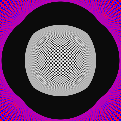 The above right was rendered with the camera moving forward at .8 the speed of light. The red/blue checkerboard is actually behind the camera, but relativistic effects enable it to be visible anyway. The above left is the image rendered at rest.