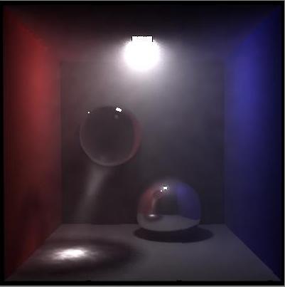 This image was rendered in 400x400 using a total of 1,040,000 photons, with 500,000 used for the volume and indirect maps, and 40,000 used for the caustic map. In all of our renders, we used final gathering for the surface photon map lookups.