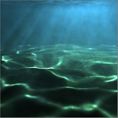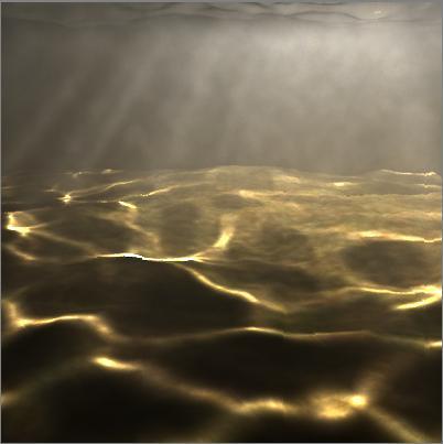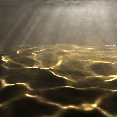 The image above shows some nice caustics on the ocean floor, and the murkiness of the water. In addition, a number of "god rays" are evident in the render, with the rays accurately originating from the source of the light, which is above the water, and to the right and front of the camera.