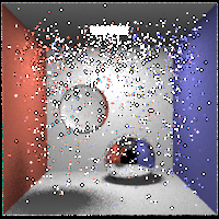The first image is a high res visualization of where the volume photons end up. It was produced by dumping the volume photon map to a scene file, with each photon represented as a translated sphere. This scene file is then rendered without global illumination, but with the spheres indicating the location of the photons. The second image is a lower res version of the photons where each photon is given a uniform color to make the general distributions easier to see. The final image shows the spatial and spectral distribution of the photons in the scene, artificially brightened to make them easier to see. One thing to note is while the scene used includes a back wall for the cornell box, the photons being visualized are from a scene file without a back wall.