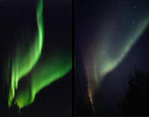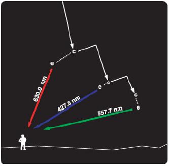 As explained previously, the color spectrum emitted from the aurora borealis are dependent on the type and the energy of the particles that collide with the precipitating electrons. These two factors are statistically dependent on the altitude. Empirical evidence shows that spectral appearance of the borealis are mainly due to the emission of light in the following three wavelengths: 630.0nm, 557.7nm, and 427.8nm. Color in these three wavelength are roughly red, green, and blue, respectively.