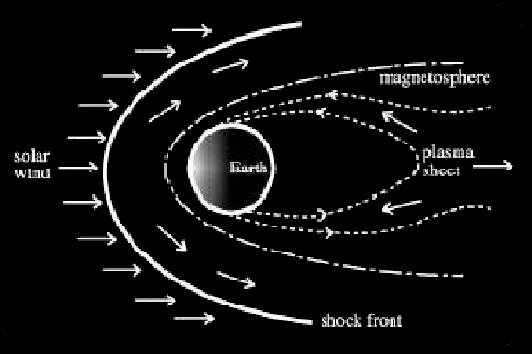 This wind is always pushing on the Earth's magnetic field, changing its shape. This compressed field around the earth is called the magnetosphere. The Earth's field is compressed on the day side, where the solar wind flows over it. It is also stretched into a long tail, called the magnetotail, and points away from the Sun. Energy from the solar wind is constantly building up in the magnetosphere, and this energy is what powers auroras.