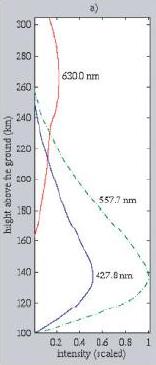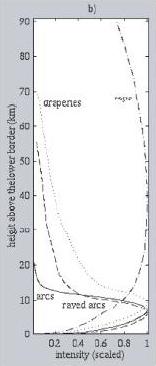 The light intensity from an aurora is proportional to the deposition of energy into the atmosphere by the precipitation electrons. As a result, the height and the intensity distribution of each auroral form are related to the average energy distribution of the particles. The intensity distribution of several aurora form are shown in the plot below.