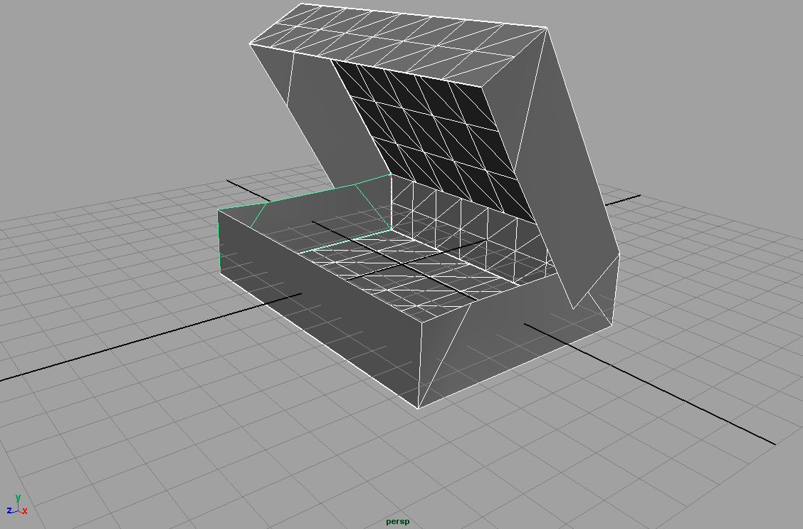 Further implementation details include the face choosing and hinging. Since we only use one surface texture to draw each box face, we must take care to decide if we're looking at the back of the face or the front. When looking at the back of the face, we must map it with a blank white face. Meanwhile, for moving the hinge of the box, some amount of transformation magic had to be done. The original box model is made as shown above at a 60 degree angle opening. It was only after we decided to open it by different amounts, by using translations and rotations in the appropriate order. This is overcomplicated by the fact that the box origin is at the box center, and not on the box hinge. |