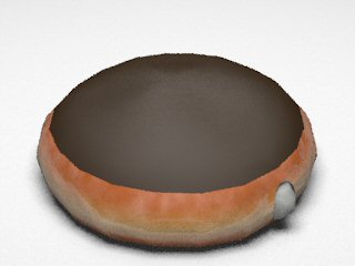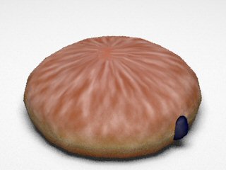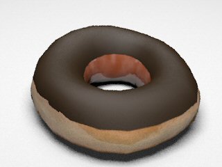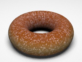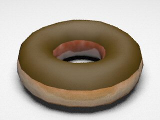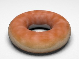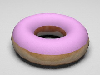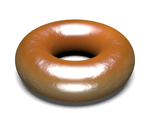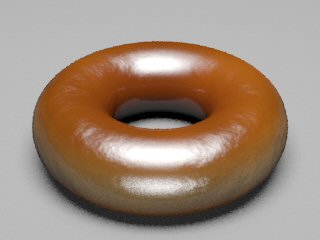 3. Glaze materialWe tried various combinations of different reflection models with different coefficient values to obtain the correct light interaction on sugar glaze. We tried modeling the glaze as a separate layer from the dough (i.e. one torus inside of the other), but the outer layer doesn't allow enough light to go through and the bump mapping in the inner layer is completely blocked. Our final glaze material contains:
