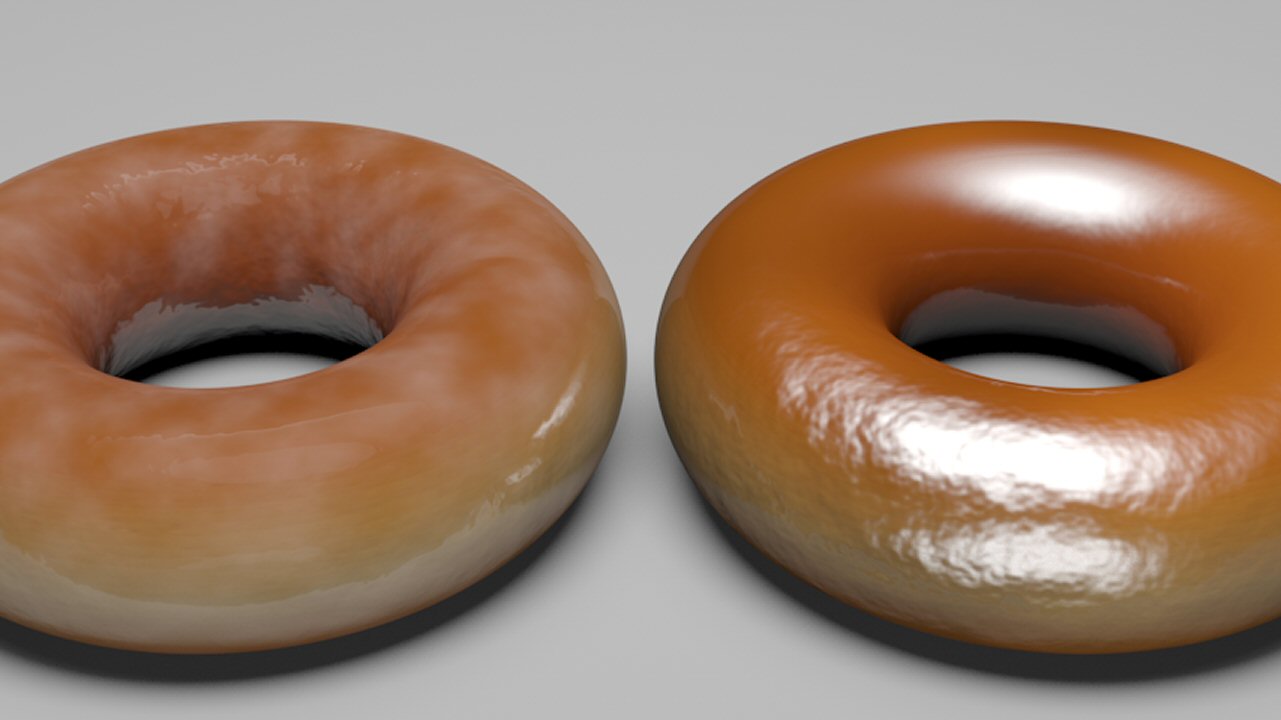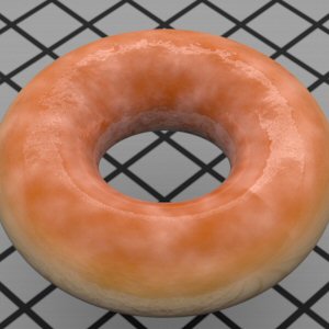 | We spent some amount of time looking at a Krispy Kreme "cold" glazed donut to get this to be perfect. The cloudy texture represents scattered air trapped under the glaze surface. This happens when the glaze is cooling. When the donuts are fresh however, the glaze is still liquid causing a rather different effect... |