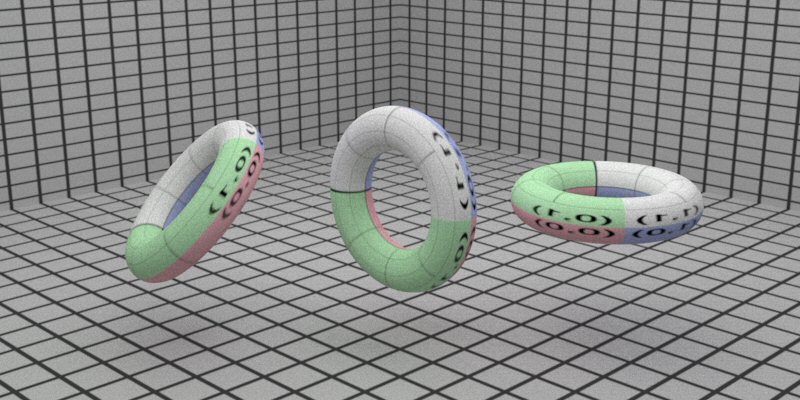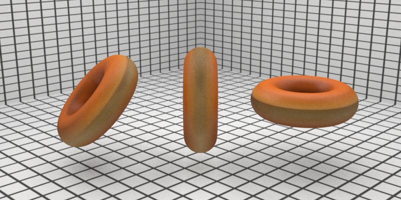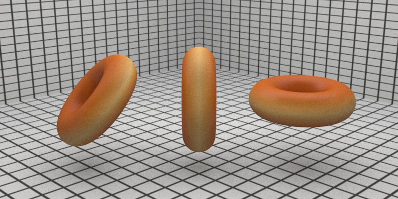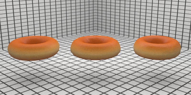 | The donut on the left is our original ideal PBRT torus. The donut in the middle has gone through a slightly non-affine transformation, the bottom has been pushed up and the top has been extended, creating dough weight. Then, the donut on the right has taken this and much more perturbation, including a lateral scale to end up slightly more oblong elliptical than the ideal circular tori. Still, all these models retain our same bump- mapping and texture mapping techniques of before. |