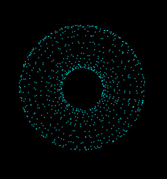 2. Diffuse ScatteringOur implementation was based on Jen et al. [2002]. We uniformly sampled the torus in the theta and phi dimensions to compute the irradiance at the sampling positions. We implemented both direct lighting and photon mapping to calculate the irradiance. Our final images are rendered with the direct lighting surface integrator. The image below shows a distribution of the sampling points around the torus surface (generated by an OpenGL program). During the integration steps, originally we stored the samples in a 2D array and only integrated samples around the intersected point, since the contribution of samples follows an exponential fall-off. This worked fine with simple environments, but failed when the lighting setup became complicated and the integration missed important points; where the illumination is high. So instead, we stored the irradiance samples in an octree, which kept track of the clustered values of all samples in the tree nodes. The integrator summed up the values (weighted by diffuse reflectance) in the tree nodes. An error function was used to decide when to stop traversing down the tree. We didn't get a chance to implement the sampling on a trianglemesh, which would give us more flexibility to render other translucent objects such as the milk.Subsurface Scattering allows us to scatter diffuse and specular reflection around the torus surface, giving the glazing effect. The following image shows the light scattering on a vertical torus. |