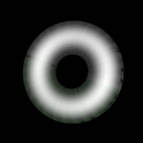 | Next we decided to implement the ideal torus shape. This required a few heavy changes to the sphere shape. Namely, torus intersection is solved by evaluating a quartic, rather than quadratic function. This provides a two-fold problem. The amount of variables involved in the solution is rather substantial, and the multiplication of many many parameters propogates error. The first of these is solved by the compile, while we found good results solving the second by increasing the numbers to doubles during calculations. Be wary of quartic solvers. The first Quartic solver we tried was incapable of solving for various solutions. This manifest itself as a series of samples missing, as is shown here: |