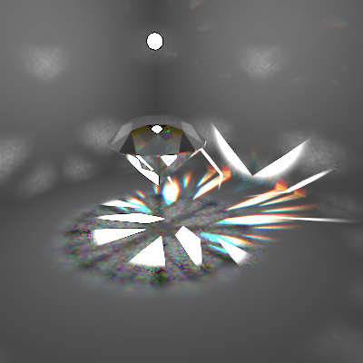 I also implemented some optimizations in order to produce better-looking, more efficient caustics with such a complex diamond scene. A light can be specified as caustic or non-caustic (the default). The DispersiveIntegrator has a "causticlights" flag. If false, it behaves normally. If true, the integrator will only use "caustic" lights when shooting photons. I wanted to implement my scene with a spotlight over the diamonds, and some global illumination. Tracing caustics from the global light would not produce nice-looking results, as it is unlikely that a photon will hit a diamond, and if it does it will tend to result in a single speckle on the wall. So I treat the spotlight as the only "caustic" light, which produced noticably better results, through somewhat of a hack.