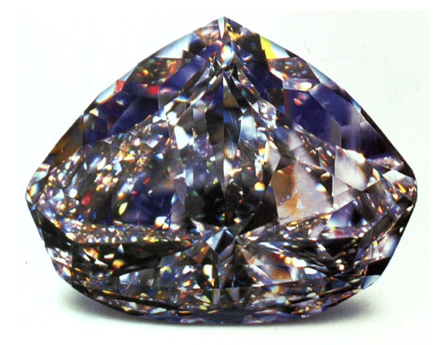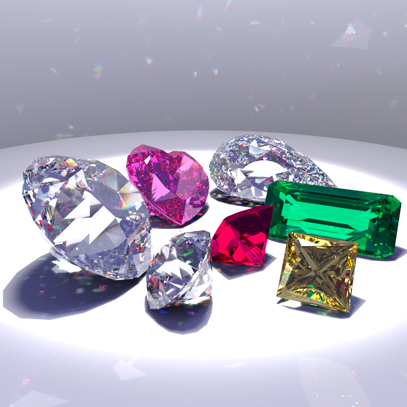 In my proposal, I set out to model some sort of wavelength-dependent surface interaction, as I've always been fascinated with the rainbow-like effects produced by such phenomena. I decided on the gemstone idea for several reasons: gemstones exhibit amazing physical properties not often seen in day-to-day objects; I was inspired by a Siggraph 2004 presentation on gemstones; and I found two papers by Sun et al that discussed the implementation issues of light dispersion in a standard ray tracer. The two images I used as references are displayed below; one shows the amazing dispersion effects in the Century diamond, and the other shows a scene I sought to duplicate.