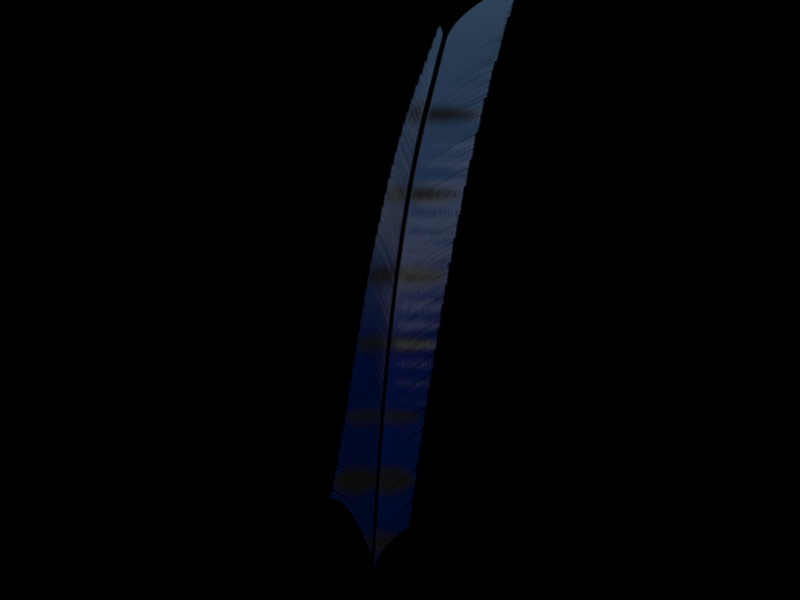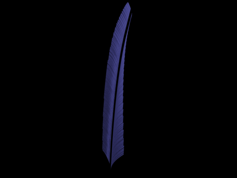 Chen's paper rendered feathers using a BTF, sampling along a 1-dimensional texture. This approach captures the microgeometry of the feathers. We wrote an implementation similar to the paper, using a modified Kajiya-Kay shading model. The modified model takes into account the microgeometry of the feather surface. At each point that the ray intersects the feather spline, we sample the 1-dimensional texture, modifying the surface properties like the tangent vectors. To accomplish this, we had to derive a new surface integrator as well as a new materials class. Here are two examples of feathers we generated and rendered (with different feather material properties):