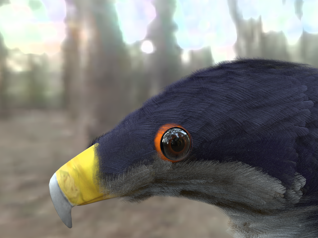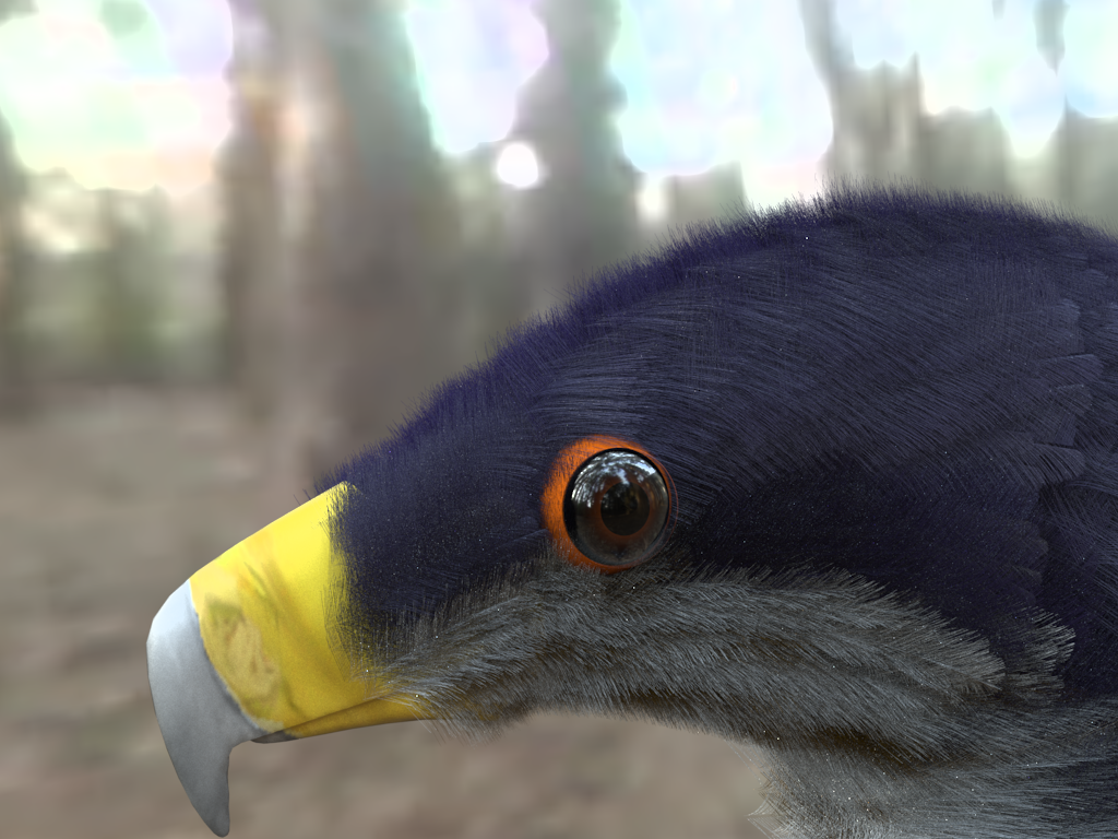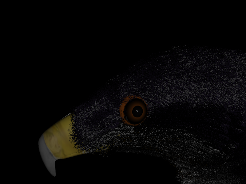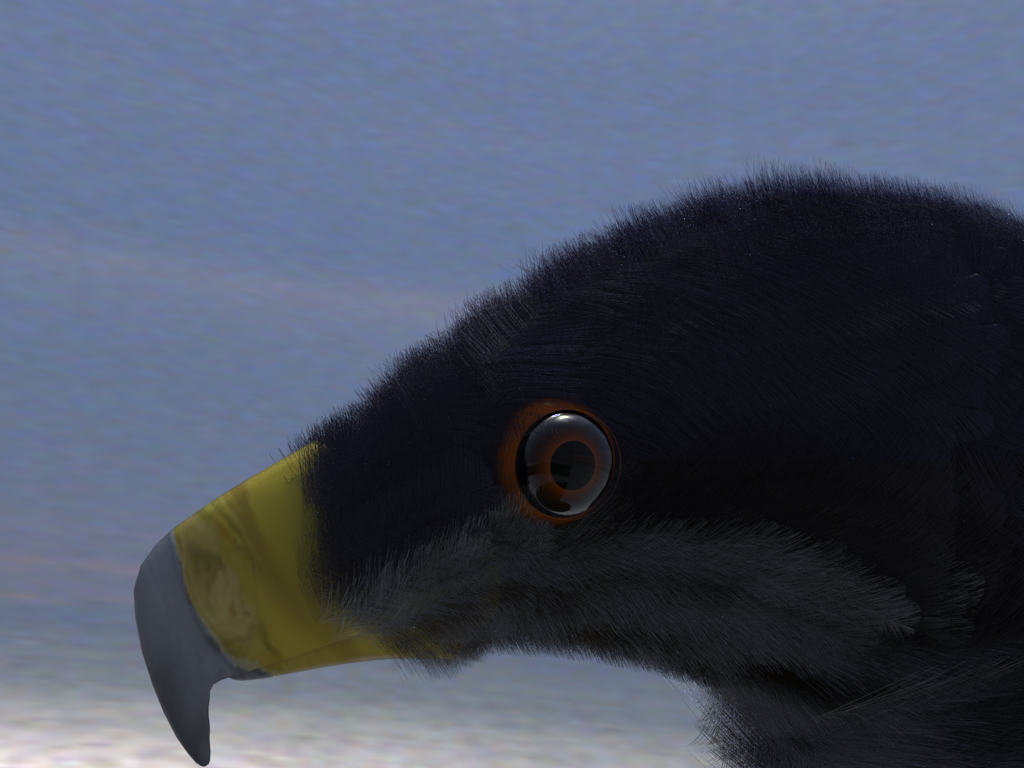 Rendering the complete scene took an exceedingly long time. We needed a high number of samples per pixel to capture the feather geometry, and initial calculations indicated that a high quality rendering could take up to a week. As an example, here is an initial low-quality rendering of the head model alone: