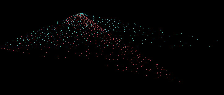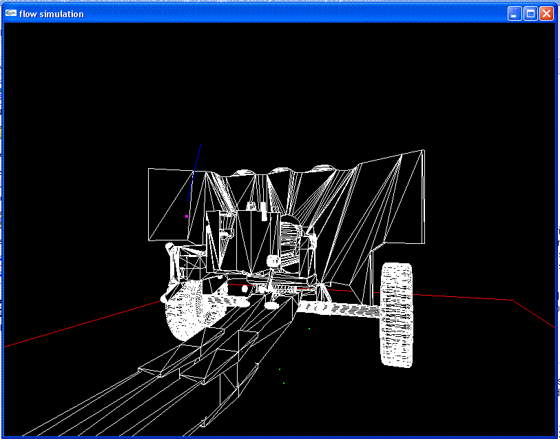 A flow simulator is built to simulate the flow pattern. Water is modeled as a particle which moves on a surface. Because the canon model we got had several meshes, the simulator had to work with arbitrary number of meshes. The hard problem was to find an adjacent triangle as a particle move on. Instead of building a new scheme or data structure, ray tracing capability of pbrt was used. In one iteration, a particle moves a small predefined distance of 2.5 mm. The simulator shoots a ray to check if there is a contact. If the ray meets other triangle, the particle will flow following the edge between two surfaces. It also shoot a ray to downward to check if the particle is still on the same triangle. If not, the particle will free fall to ground or stick to other triangle. The simulation for a particle ends when it falls on a ground or the number of iteration is over five hundreds. The particle can be stuck at concave shape. The cost of having 2 ray tracings per iteration was tolerable. It took less than 3 hours to generate a half million traces. Following figure shows the simulator integrated in pbrt and glut (flow.cpp)