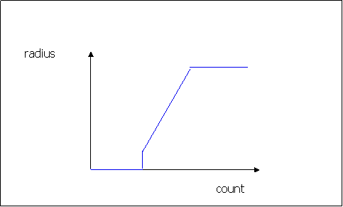 The profile of the flow is recorded on the subdivided triangle mesh. Each triangle records how many times particles have passed on itself. This profile is post-processed to generate rendering file (ground.cpp, surface.cpp). Simplifying assumptions are made - the more particle passed on the spot, the more likely it has stain. Two options were explored to render the stain - using texture and micro geometry. The density of stain is converted to exr texture file and used to modulate the texture color. Due to the difficulty of generating uv coordinate, this scheme is experimented only on ground. The resulting picture was flat compared to the second option. In second option, a large number of spheres are used to draw stain. The result was more convincing. The drawback is large pbrt file size. The rendering time was affected less than factor of two. Here is a mapping used to calculate radius of sphere given the contact counting. The triangle which is contacted more often will have larger sphere on it.