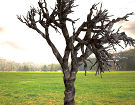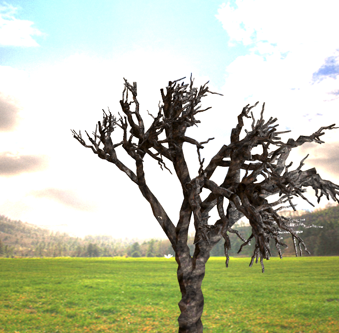 Priscilla and Tom generated the branches of the cherry blossom tree using an L-system. They added complexity using displacement mapping (to enhance the silhouette) and bump mapping (for the rings in the bark). They procedurally-generated cherry blossoms using Mathematica and rendered them using thin layer subsurface scattering. [