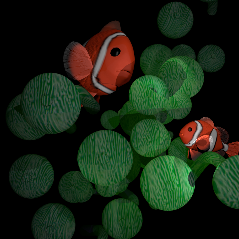 Christina and Crystal implemented by fast-hierarchical BSSRDF scattering and multiple-thin-layer scattering to rendering this underwater scene of a clown fish in a field of anemone. The anemone were procedurally generated. [