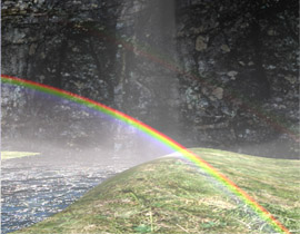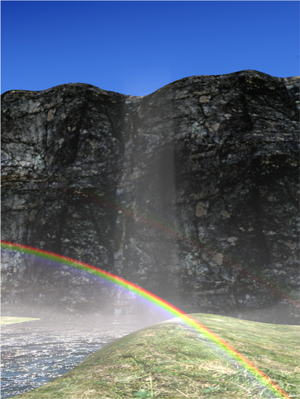 James and Qiqi used an off-the-shelf fluid dynamics package to generate a volume representing a waterfall and accompanying spray into the air. They experimented with single and multiple scattering through the volume, and modeled wavelength-dependent scattering behavior to generate rainbows. [