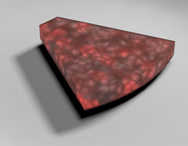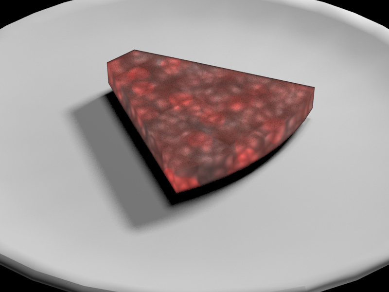 Curtis implemented volumetric photon mapping and procedurally computed a density texture to produce this rendering of a slice of watermelon. [
