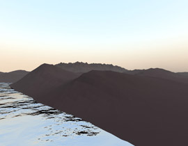 Given a location on the each and time of day, Dick computed the position of the sun in the sky and rendered this realistic sunrise. A realistic atmosphere model simulating Mie scattering gives the sky it's color. [