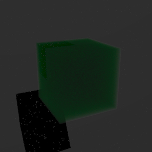 Isabelle implemented subsurface scattering to create the image at left. Notice the bright ring around the edges of the cube where the optical distance is shortest. [