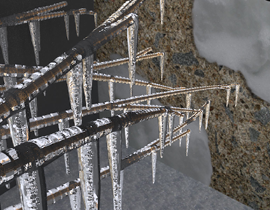 Omar modeled some of the interesting properties of ice including birefringence (multiple indices of refraction for one material) and the quasi-liquid layer (a thin layer of semi-structured water molecules) to create this image of icicles. [