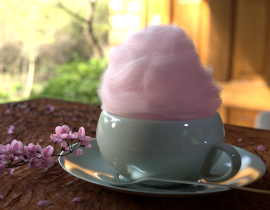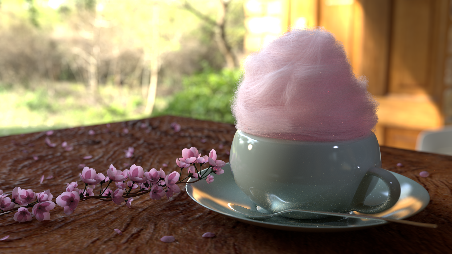 Chenlin, Hubert, and Jiren modelled cotton candy using a set of procedurally generated cylindrical curves for the candy's fibres surrounding a homogenous inner volume for the candy's interior.