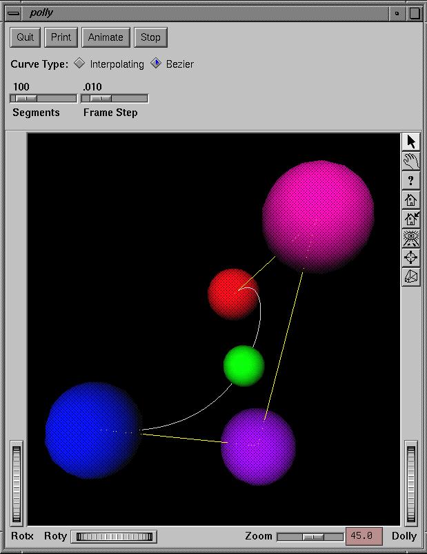 The partly transparent colored spheres mark the control points of the curve. If the curve is an interpolating one, it passes through these points at equally spaced parameter values; otherwise, the spheres mark the Bézier points of the curve. The radio buttons entitled "Curve Type" set the type of the curve.