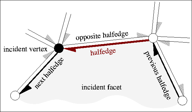 Vertices represent points in space. Edges are straight line segments between two endpoints. Facets are planar polygons without holes defined by the circular sequence of halfedges along their boundary. The polyhedral surface itself is allowed to have holes. The halfedges along the boundary of a hole are called border halfedges and have no incident facets. An edge is a border edge if one of its halfedges is a border halfedge. A surface is closed if it contains no border halfedges. A closed surface is a boundary representation for polyhedra in three dimensions. The convention is that the halfedges are oriented counterclockwise around facets as seen from the outside of the polyhedron. An implication is that the halfedges are oriented clockwise around the vertices. The notion of the solid side of a facet as defined by the halfedge orientation extends to polyhedral surfaces with border edges although they do not define a closed object. If normal vectors are considered for the facets, normals point outwards (following the right hand rule).