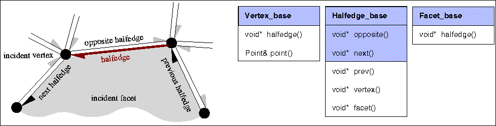 The data structure provided here is known as the FE-structure [Wei85], as halfedges [Män88, BFH95] or as the doubly connected edge list (DCEL) [dBvKOS97], although the original reference for the DCEL [MP78] describes a different data structure. We continue naming it halfedge data structure (HDS). This data structure can also be seen as one of the variants of the quad-edge data structure [GS85], reduced to support only orientable surfaces. In general, the quad-edge data structure has a richer modeling space and can represent non-orientable 2-manifolds. The dual and the primal graph are symmetrically represented; the same algorithms can be applied to the dual graph as well as to the primal graph. This implies a lack of static type checking to distinguish between facets and vertices. Even though halfedges are similar to the winged edge data structure [Bau75] or the original reference for the DCEL [MP78], they are not equivalent, since the traversal algorithms are forced to search for certain incidences where the information is directly available in the halfedge data structure. An overview and comparison of these different data structures together with a thorough description of the design implemented here can be found in [Ket98].