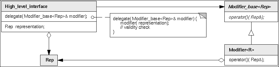 The solution provided here follows the known Strategy pattern [GHJV95], see Figure [ref:figureModifierDesign]. The abstract base class CGAL_Modifier_base<R> declares a pure virtual member function operator() that accepts a single reference parameter of the internal representation type. The member function delegate() of the high-level interface calls this operator() with its internal representation. An actual modifier implements this virtual function, thus gaining access to the internal representation. Once, the modifier has finished its work, the member function delegate() is back in control and can check the validity of the internal representation. Summarizing, a user can implement and apply arbitrary functions based on the internal representation and keeps the benefit if a protected high-level interface. User provided modifiers must in any case return a valid internal representation or the checker in the high-level interface is allowed (and supposed) to abort the program. The indirection via the virtual function invocation is negligible for operations that consists of more than a pointer update or integer addition.