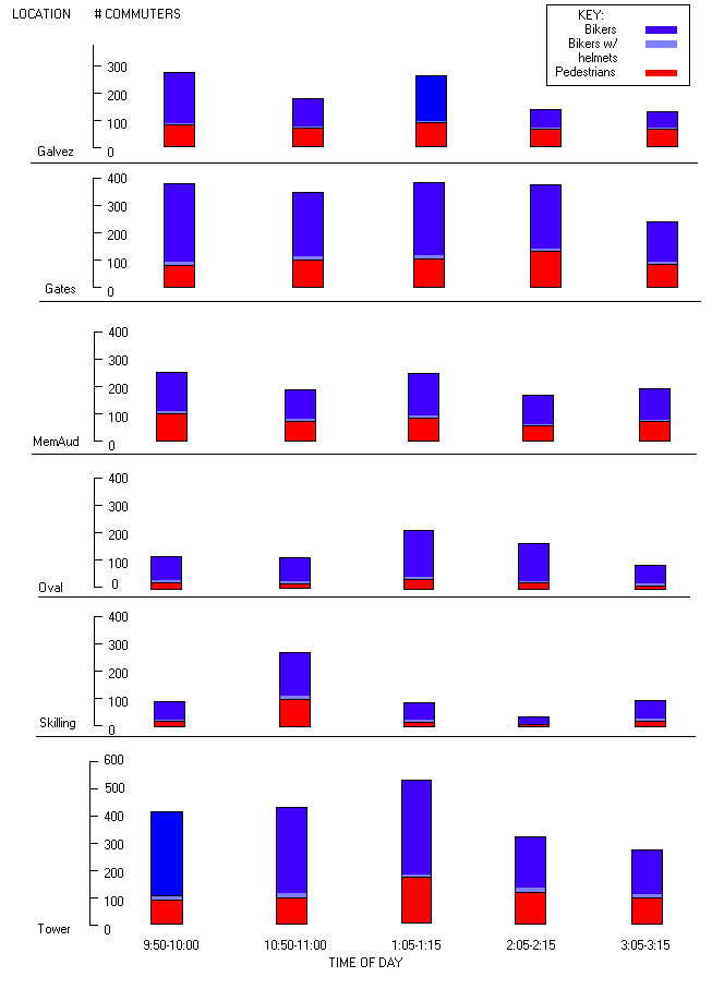 Stanford bike trafficMarisa Macias, Janet Yu, and Xijia Chen Stanford is a campus of bicyclists, especially during the passing period between classes. Where can you find the most cyclists? The least? How does it vary through the day? And how safely do they ride? Check out this study by Marisa, Janet, and Xijia. Click on the image at left for an enlarged version of the data they acquired, and click here for a Powerpoint presentation summarizing their experimental protocol and their conclusions. |
