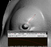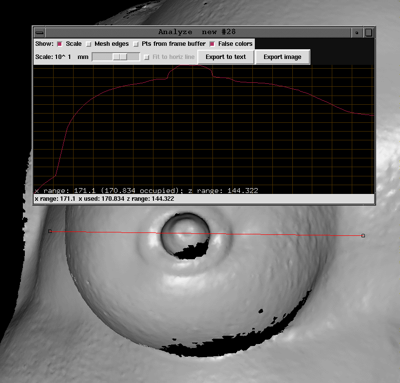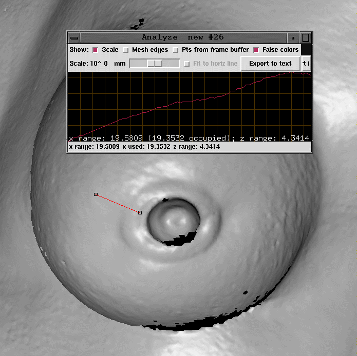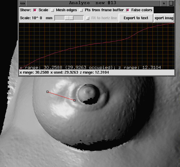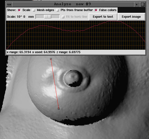 Now, since I am no oncologist and am not qualified to make a judgment or measurement concerning the size of the lump (I cannot make the distinction between the normal curvature of the breast and the gradual curvature of the lump), the most convincing measurements I could take focused on the length and width of the depressions.